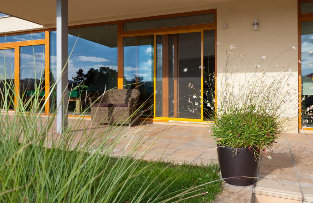 Posuvní síť s venkovními žaluziemi v šedé barvě na terase s dekorem
